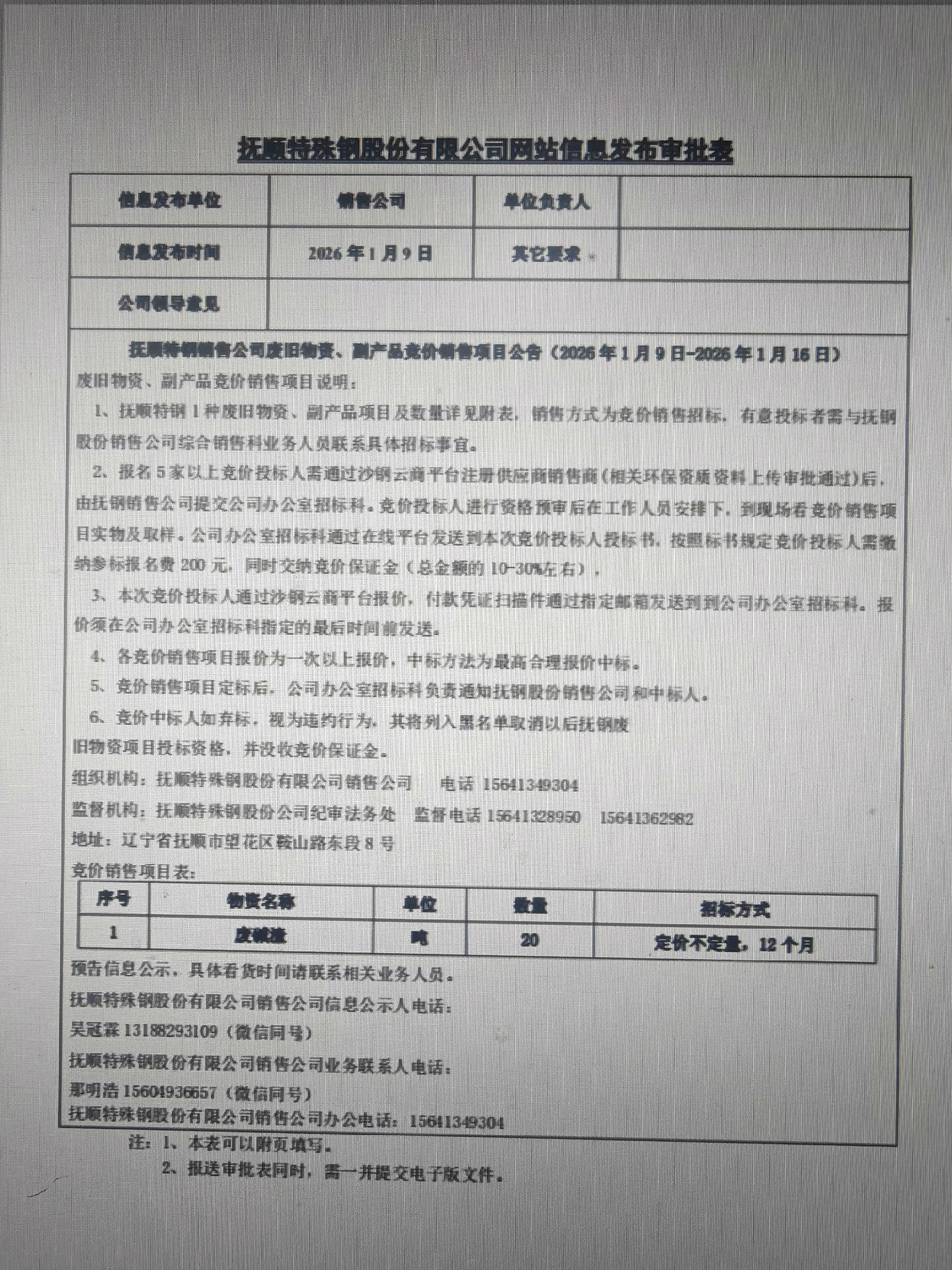 撫順特鋼銷售公司廢舊物資、副產(chǎn)品競價銷售項目公告(1月9日-1月16日)