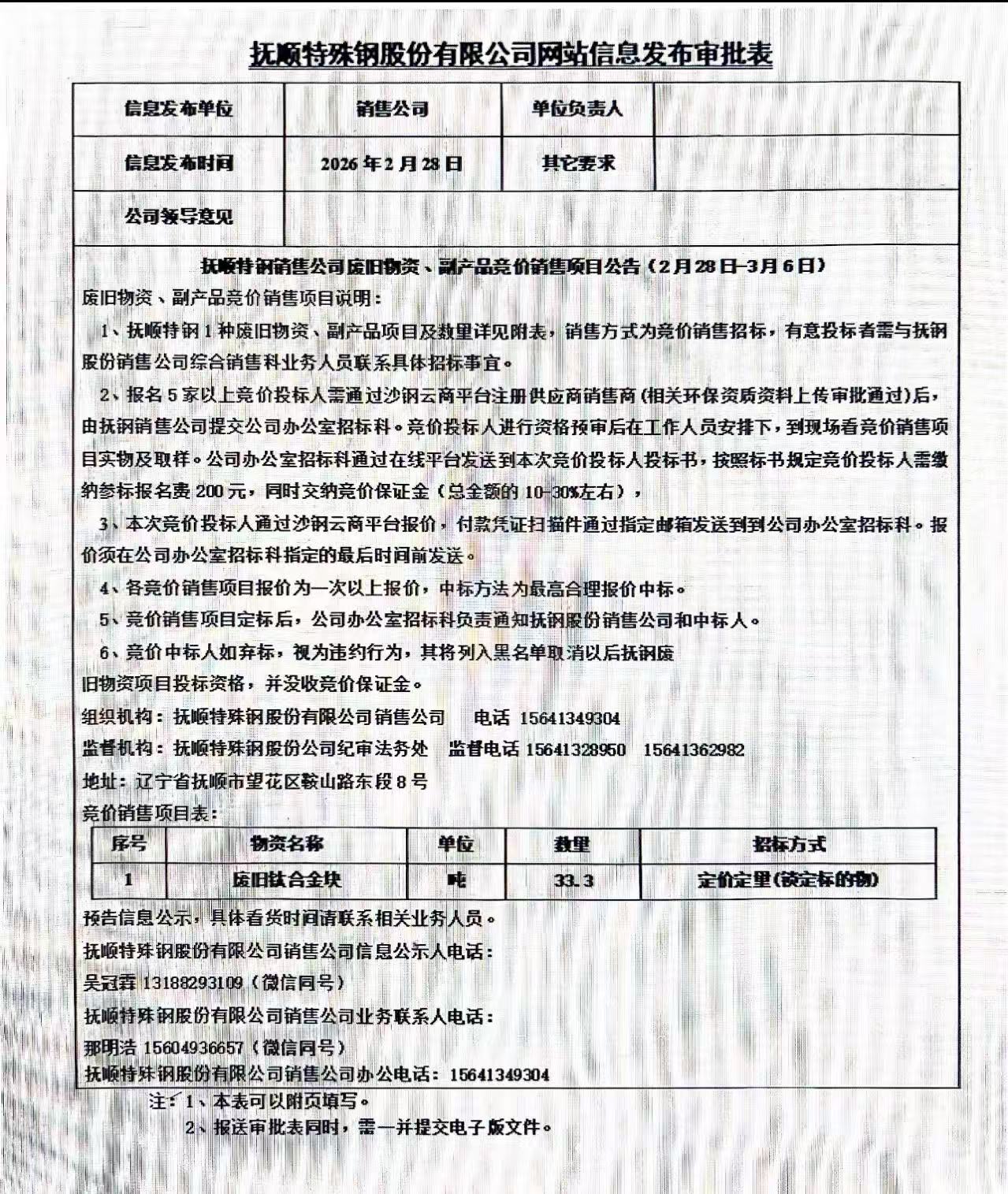 撫順特鋼銷售公司廢舊物資、副產(chǎn)品競(jìng)價(jià)銷售項(xiàng)目公告(2月28日-3月6日)